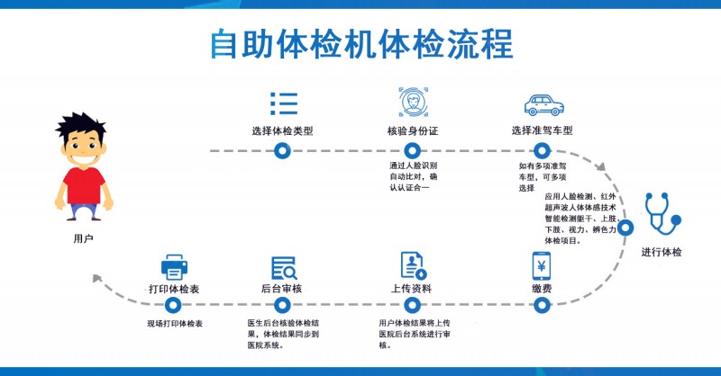 證照通自助體檢機(jī)結(jié)合了證件自助拍照機(jī)的功能,系統(tǒng)具有操作簡單、快速高i效等優(yōu)i點,所有體檢項目均由系統(tǒng)自動完成,體檢人員根據(jù)語音提示和顯示器畫面提示即可完成操作。該系統(tǒng)可安裝在有授權(quán)的駕?;蜍嚬芊炙鶅?nèi),不但節(jié)省了體檢站的人力.有效提高了體檢效率,關(guān)鍵方便了人民群眾。