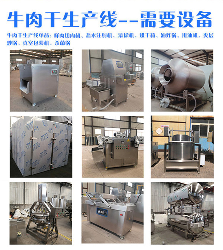 我們是做牛肉干加工設(shè)備的,那么咱們聊一下,現(xiàn)在市面上見的比較多的牛肉干應(yīng)該是手撕牛肉了吧,從客戶的咨詢來看,手撕牛肉干也是大多數(shù)客戶想做的,以前我們吃的比較多的是牛肉粒,在超市看見比較多的也是大包的包裝里面有小的包裝,現(xiàn)在感覺,還是手撕牛肉干比較好吃,那么手撕牛肉干是用哪些設(shè)備做的呢?牛肉干有很多口味,同樣也有很多做法,不同的牛肉干會有不同的工藝配方,有的需要的設(shè)備也是不一樣的,做牛肉干需要那些設(shè)備呢?這些設(shè)備又是怎樣操作呢?現(xiàn)在就跟大家簡單介紹一下做牛肉干需要的設(shè)備,解凍槽(假如咱們是鮮肉的話,就不需要這個(gè)設(shè)備了)---鹽水注射機(jī)----切條切片機(jī)----真空腌制機(jī)---烘干機(jī)(或者煙熏爐都可以)---真空包裝機(jī)----高溫殺菌鍋----風(fēng)干機(jī)---打包入庫(食品加工機(jī)械廠家Tel:138*5448-1138)