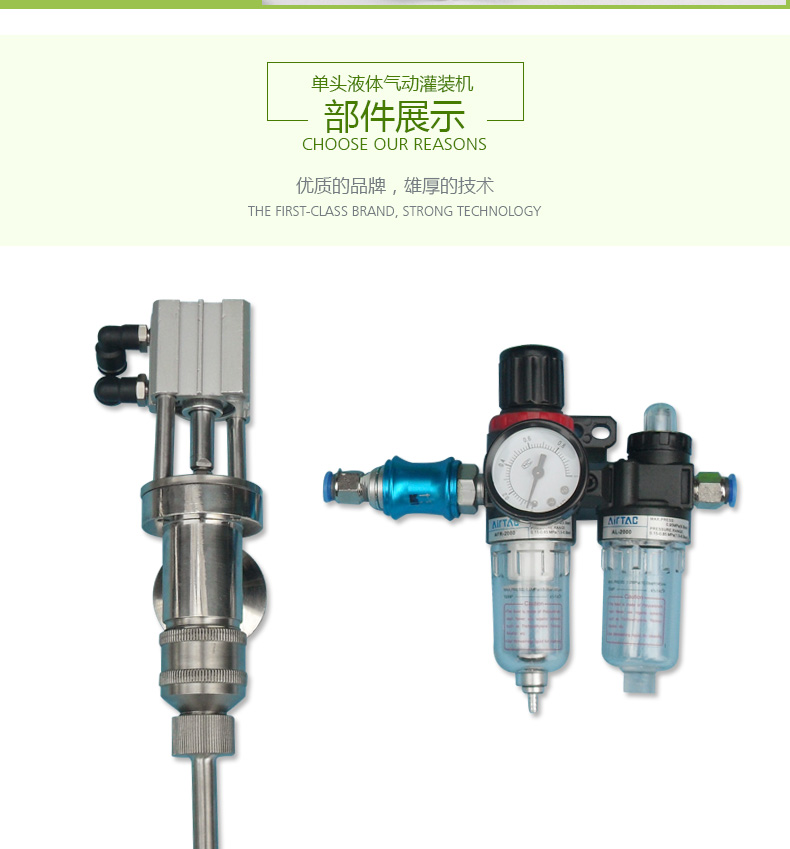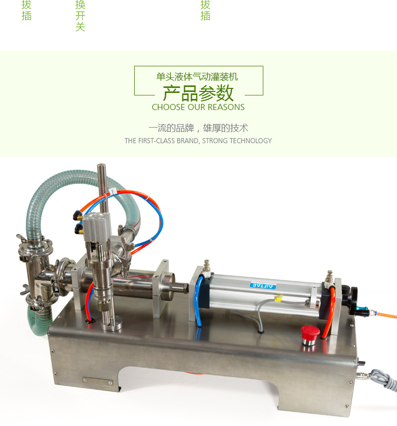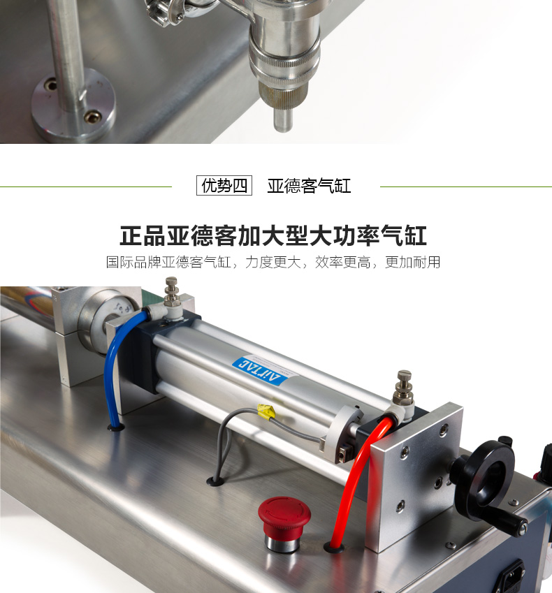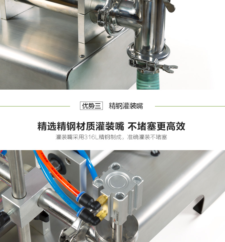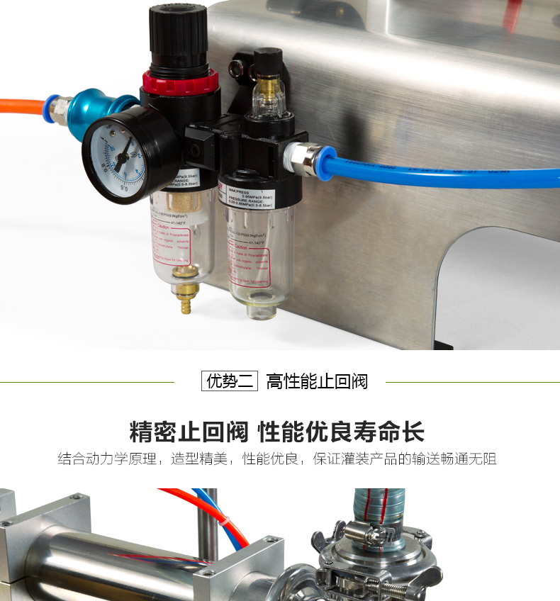 · 防滴漏灌裝系統(tǒng):灌裝時(shí)氣缸上下動(dòng)作,帶動(dòng)悶頭。氣缸向上運(yùn)動(dòng),則悶頭向上,即閥門(mén)打開(kāi),開(kāi)始灌裝物料;反之則停止灌裝。并且杜絕滴漏與拉絲的現(xiàn)象。