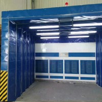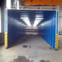 伸縮房是提供涂裝作業(yè)環(huán)境的設(shè)備,在噴漆房中制造的人工環(huán)境,滿足涂裝作業(yè)對環(huán)境的溫度、濕度、照度、潔凈度的需求; 保護操作者的安衛(wèi)生; 治理涂裝作業(yè)的廢物排放,保護環(huán)境免遭污染?;\統(tǒng)的說是為了使噴涂涂裝時產(chǎn)生的浮游涂料粒子(霧粒) 及時從噴涂的現(xiàn)場,以涂裝質(zhì)量,保護環(huán)境,維護操作人員的。隨著涂裝行業(yè)的快速發(fā)展,不僅大異型噴漆房的需求量不斷增長,而且要求高的型噴漆房的市場也越來越大。伸縮房是近幾年來開發(fā)的一種簡易處理漆霧和除塵的涂裝環(huán)保設(shè)備,是專門為解決較大型工件移動困難而研制的實用型產(chǎn)品,生產(chǎn)工藝上簡化了不斷用車間行車吊運大型工件來回周轉(zhuǎn)的工藝流程。伸縮房主要是為節(jié)省車間工作區(qū)的綜合利用而專門設(shè)計的,已經(jīng)在機車、電機、電力設(shè)備、工程機械和機床等行業(yè)成功應(yīng)用。伸縮房主要以干式為主,部分特殊的噴漆房要求帶一個小水簾柜。這類噴漆房一般在空氣潔凈度、漆霧處理效率、廢氣處理效率、漆膜等級等方面要求均不高,適用于簡易噴漆、打磨、刮膩子等工藝。伸縮房整體為鋼制框架結(jié)構(gòu),可前后伸縮移動??蚣苤g的滑動連接機構(gòu)框架在驅(qū)動裝置的帶動下沿地面的軌道前后豎直平行移動,同時帶動蓬布展開合攏。移動室收縮合攏時,將工件移入工作區(qū),展開時可進行工件的噴漆或打磨等工作。在不噴漆的工作時間內(nèi),可將移動區(qū)域合攏,騰出空間場地作為其他與噴漆交叉作業(yè)的工序使用。該設(shè)備根據(jù)客戶要求,漆霧處理設(shè)備可為濕式或干式兩種類型。