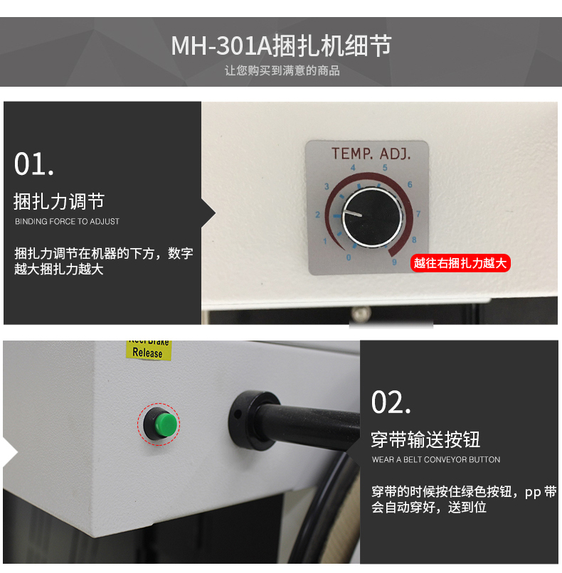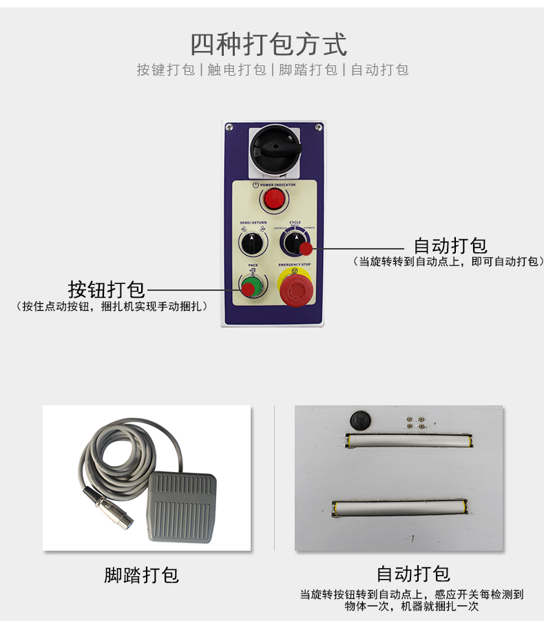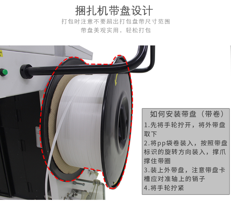 開關(guān)打到MANV手動狀態(tài),再按一下手動打帶按釩 START,先試捆三件,檢查粘合、拉緊和粘合處打包帶對正狀態(tài),如試捆三件都合可要求時方可打到自動狀態(tài)進行正式工作;(5)使用過程中,如發(fā)現(xiàn)異常,操作者應(yīng)立即停機報修;(6)設(shè)備使用過程中禁止隨意晃動檢測工件的光電開關(guān);(7)收帶拉緊力在調(diào)節(jié)好后應(yīng)固定擋位,禁止隨意調(diào)節(jié);