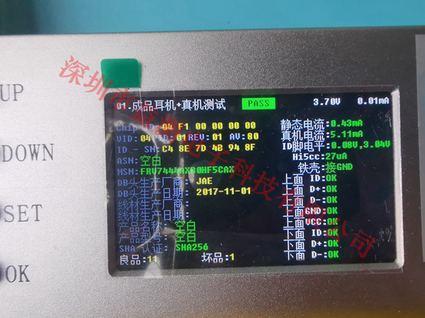 先通過儀器測出大部分部分問題,比如兩面金手指開路短路,普通認(rèn)證IC問題讀不到碼,動態(tài)認(rèn)證IC問題(在手機(jī)上10多秒才彈窗), PASS后再切換到手機(jī)測試音頻、MIC、線控部分(需要手動操作手機(jī)),優(yōu)勢是雙面測試,先快速檢出大部分問題。