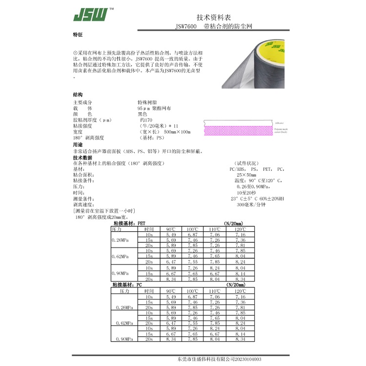 JSW7600防塵網(wǎng)適用于揚(yáng)聲器前面板(丙烯 聚苯乙烯.鋁制板等)開口部做防塵遮蔽用途。由于JSW7600防塵網(wǎng)開口形狀的構(gòu)造進(jìn)行涂膠,所以有時(shí)在網(wǎng)布上可看到類似魚眼狀的粘著劑堆積物,其分布并不均勻。JSW7600防塵網(wǎng)是一款高端防塵網(wǎng),非常適用于高端產(chǎn)品的揚(yáng)聲器的無鹵素型材料.JSW7600防塵網(wǎng)屬于可重復(fù)粘合型的熱熔膠,并且不含鹵素。經(jīng)過熱壓后粘性可達(dá)到11.3N/2cm.減少防塵網(wǎng)背膠工序。起到遮蔽及防塵作用。JSW7600防塵網(wǎng)應(yīng)用特點(diǎn):無鹵素。因是熱粘結(jié)型,同利用粘膠帶粘合的加工方法相比可減少工序。