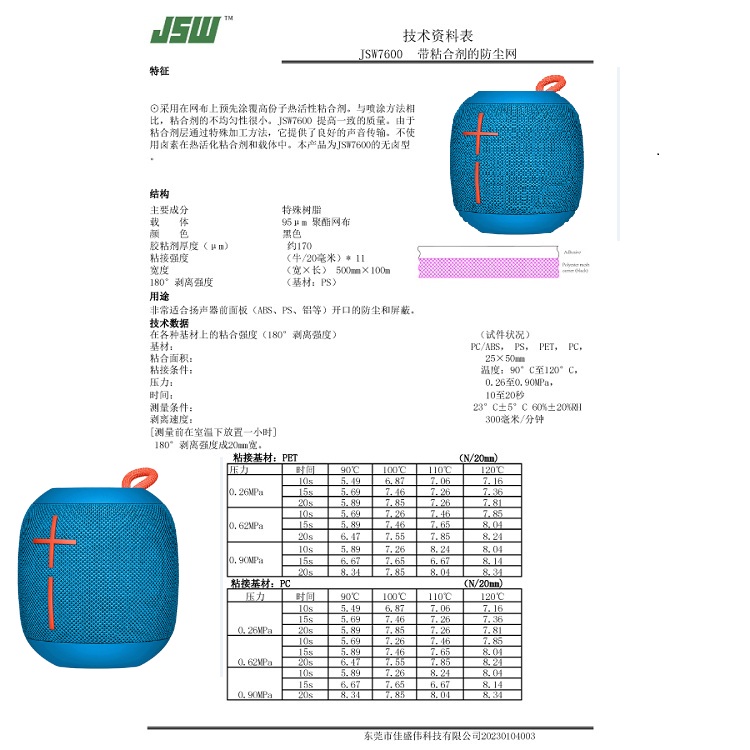 JSW7600喇叭網(wǎng)適用于揚(yáng)聲器前面板(丙烯 聚苯乙烯.鋁制板等)開口部做防塵遮蔽用途。由于JSW7600喇叭網(wǎng)開口形狀的構(gòu)造進(jìn)行涂膠,所以有時(shí)在網(wǎng)布上可看到類似魚眼狀的粘著劑堆積物,其分布并不均勻。JSW7600喇叭網(wǎng)是一款高端防塵網(wǎng),非常適用于高端產(chǎn)品的揚(yáng)聲器的無鹵素型材料.JSW7600喇叭網(wǎng)屬于可重復(fù)粘合型的熱熔膠,并且不含鹵素。經(jīng)過熱壓后粘性可達(dá)到11.3N/2cm.減少防塵網(wǎng)背膠工序。起到遮蔽及防塵作用。JSW7600喇叭網(wǎng)應(yīng)用特點(diǎn):無鹵素。因是熱粘結(jié)型,同利用粘膠帶粘合的加工方法相比可減少工序。