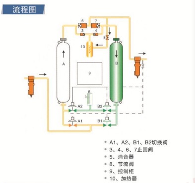 吸附:濕空氣從下管系經(jīng)A1閥進(jìn)入A干燥罐體,自下向上流過吸附劑床,干燥后的空氣從上管系排出。
