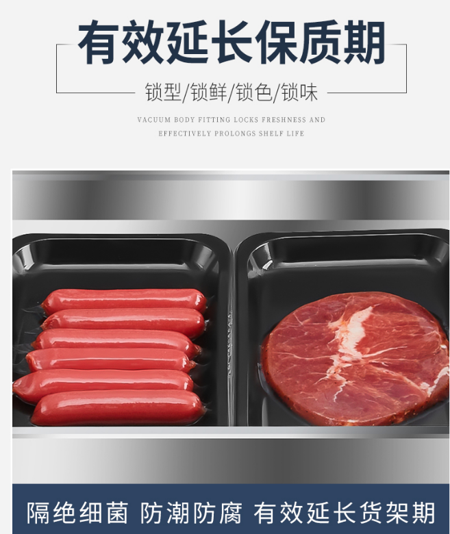 真空貼體包裝是一種變革性的食品包裝方式,包裝后的產(chǎn)品像加了一層透明的皮膚讓人一目了然,并且不會改變產(chǎn)品的形態(tài),把產(chǎn)品最好的狀態(tài)定格展現(xiàn)出來,并保證了冷藏產(chǎn)品的新鮮度。廣泛應用于肉類、家禽、海鮮和奶酪等食品行業(yè)。